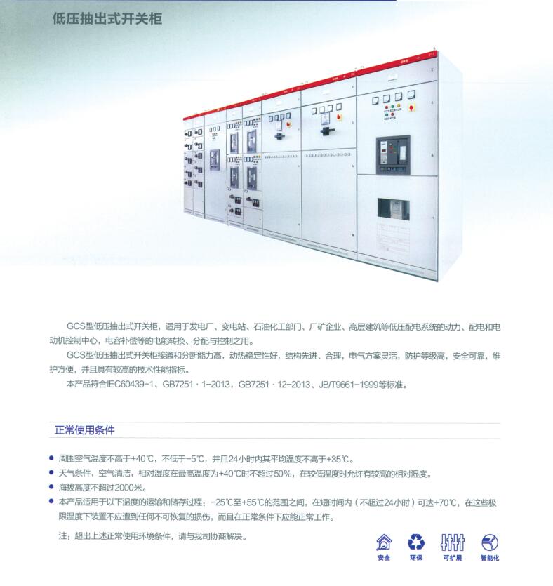 GCS型低压抽出式开关柜,适用于发电厂、变电站、石油化工部门,厂矿企业、高层建筑等低压配电系统的动力、配电和电动机控制中心,电容补偿等的电能转换、分配与控制之用。GCS型低压抽出式开关柜接通和分断能力高,动热稳定性好,结构先进、合理,电气方案灵活,防护等级高,安全可靠,维护方便,并且具有较高的技术性能指标。