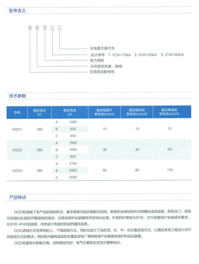 GGD型低压固定式成套开关设备,可广泛地用在发电厂、变电所、厂矿企业等电力用户的交流50Hz额定电压400V的配电系统中,做为动力、照明及配电设备的电源转换、分配和控制之用。GGD型低压配电柜具有分断能力高,动热稳定性好,结构新颖、合理、电气方案切合实际,系列性、适用性强、防护等级高等特点,可作为更新换代的产品使用。